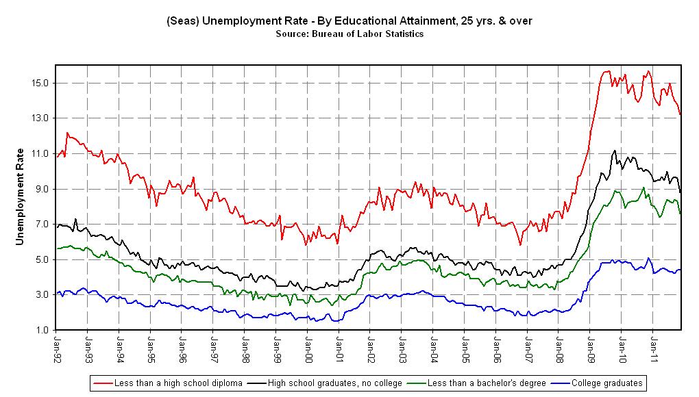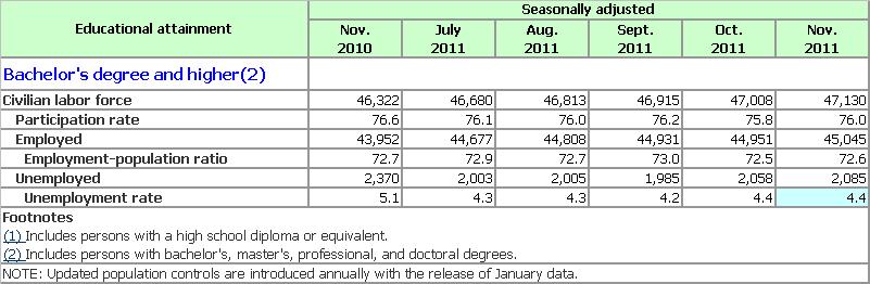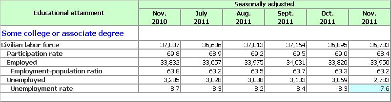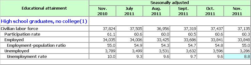 Next, according to the BLS, the unemployment rate among those 25 years of age and over who are high school graduates was 8.8%, which is still rather high, while the labor force participation rate was 60.3%. That means that while some 33.8 million in this category were employed, another 3.3 million were considered unemployed. Note: It’s curious that the overall unemployment rate dropped from 9.0% in October 2011 to 8.6% in November of 2011, primarily due to the fact that 315,000 workers dropped out of the labor force, and that the civilian labor force among high school graduates — with no college, fell by 302,000. Is this just a coincidence?