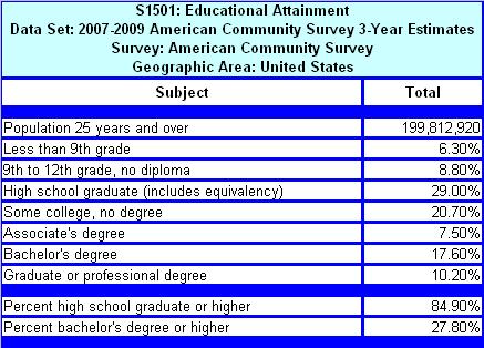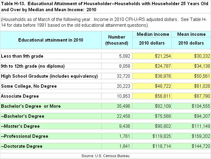As I mentioned in, Obama’s Square Deal and Just Deserts, and according to the U.S. Census Bureau, in 2010, households with a householder 25 years old and over with less than a 9th grade education earned median incomes of $21,254 and mean incomes of $30,232, while those with some college earned median incomes of $48,722 and mean incomes of $61,026, and those with a Bachelor’s Degree or higher earned median incomes of $82,109 and mean incomes of $104,555 (see table below). So anyone who wants to earn their ‘fair share’ should be prepared to plot their ‘own course’, and to complete the necessary steps. How high you reach, and how you get there is simply a matter of free will. So unless Obama is proposing to take away free will, or to somehow make college education mandatory, all of this “level playing field” rhetoric is just smoke.