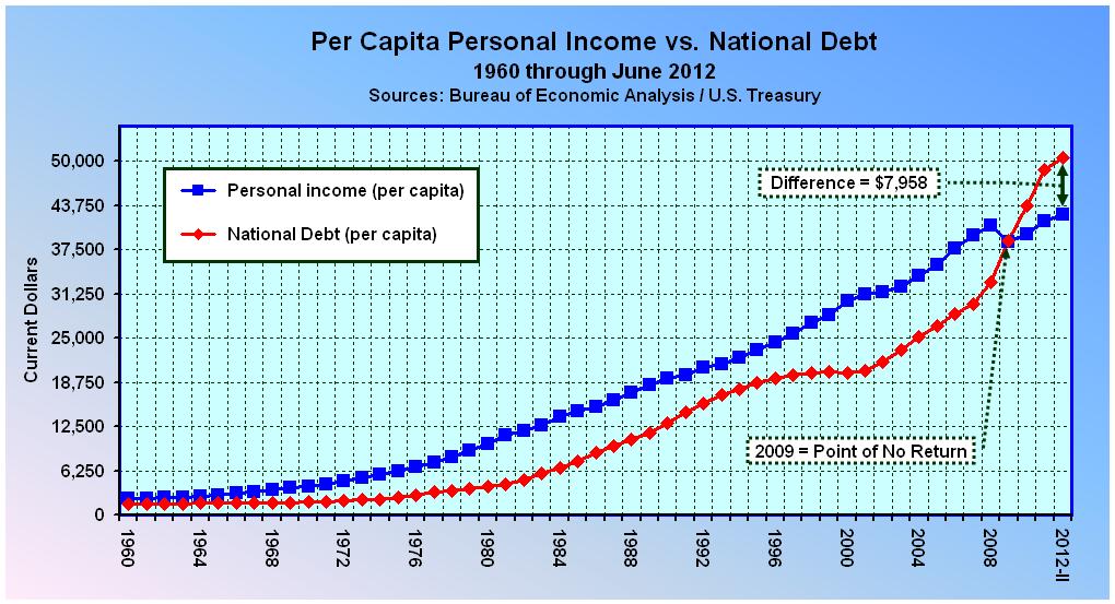 What Obama’s grand achievement has amounted to is a $20,329 increase in the per capita share of the national debt for every man woman and child in America, and even worse, an increase of $56,266 for every U.S. taxpayer. Has your personal income increased by $20,329, over the last four years (for each person in your household)? Probably not, but irrespective of whether it did, as a U.S. taxpayer, your share of future income taxes just went up by $56,266 courtesy of Obama’s War on Wealth.