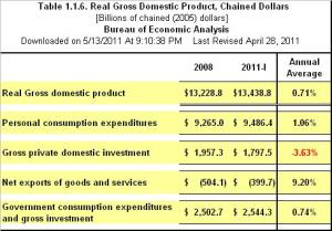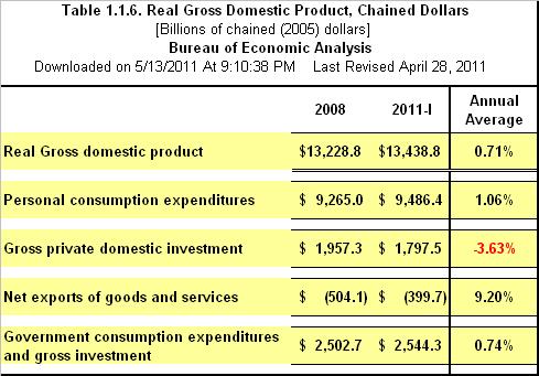 The table below shows that real GDP grew at an annual rate of 0.71% from the end of 2008 through the first quarter of 2011. During the same period, personal consumption increased at an annual rate of 1.06%, private investment declined at an annual rate of -3.63%, net exports increased at an annual rate 9.2%, and government consumption increased at an annual rate of 0.74%.