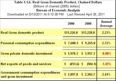 As the next table reveals, real GDP grew at an annual rate of 2.23% from the end of 2000 through 2008. During the same period, personal consumption increased at an annual rate of 2.72%, private investment declined at an annual rate of -0.08%, net exports declined at an annual rate -1.45%, and government consumption increased at an annual rate of 2.41%.