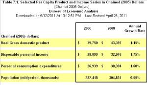 Of course the best measurement of GDP is found in real per capita results, after all the economy is not static. The effects of population growth combined with inflation can weigh heavily on the economy. The U.S. population has continued to grow at an annual rate of 1.0% since 2000; meanwhile inflation has grown from nearly 0.00% to 3.16% since January of 2009. So let’s see how this combination has affected GDP, disposable personal income, and personal consumption.