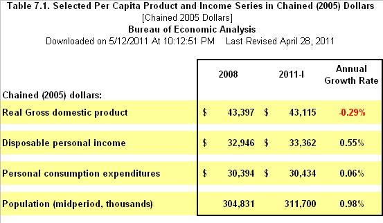 According to the latest report from the Bureau of Economic Analysis, real gross domestic product increased at an annual rate of 1.8% in the first quarter of 2011. But by now most of us understand that this is merely calculated by measuring an increase of roughly 0.45 percent from the fourth quarter of 2010 to the first quarter of 2011, and then multiplying the result by four (.045 * 4 = 1.8). That’s all well and good, but it doesn’t necessarily tell us the truth. What most of us really want to know is the annual rate of GDP growth since Obama’s policies were implemented, and how that compares to the previous administration. To arrive at the answer, one must first measure the annual rate of GDP growth from the time Obama took ownership of the economy, and then compare this to the previous rate. In terms of real (i.e. inflation-adjusted) per capita (i.e. population-adjusted) GDP, the U.S. economy has declined at an annual rate of -0.29% since 2008, as compared to an annual growth rate of 1.15% during the eight-years prior. That’s a decline of 396.5% for the mathematically inclined.