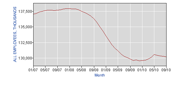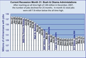 The chart above shows, “the job market recovery is faltering at best, after 31 months of Bush/Obama policies. There are 8 million fewer Americans now employed than in December, 2007.”