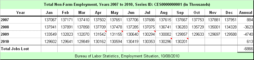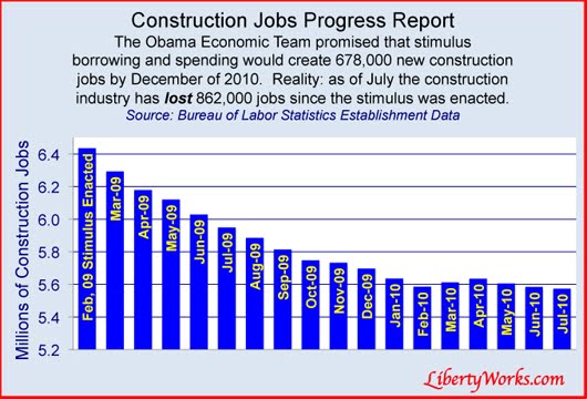 According to Liberty Works, the Obama Economic Team promised that stimulus borrowing and spending would create 678,000 new construction jobs by December of 2010. However, by July of 2010, the construction industry had actually lost 862,000 jobs.