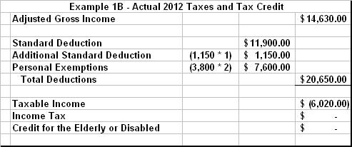 And there’s another problem. Because the standard deduction for a single person over the age of 65 in 2012 is $7,400 [5,950 + 1,450], and the personal exemption allowance is $3,800, your adjusted gross income must be greater than $11,200 to even have an income tax liability. In other words, if your adjusted gross income is under $11,200, you don’t qualify. But if your AGI is between $11,200 and $17,500, and the nontaxable portion of your social security benefits is less than $5,000 (item #1 (b)), then you might qualify.