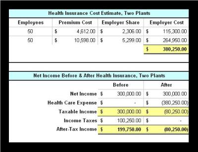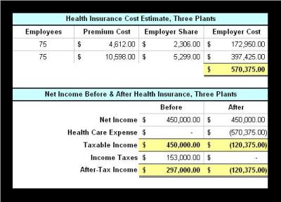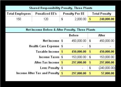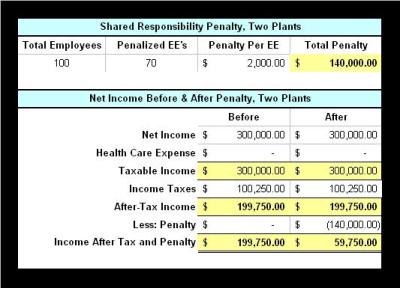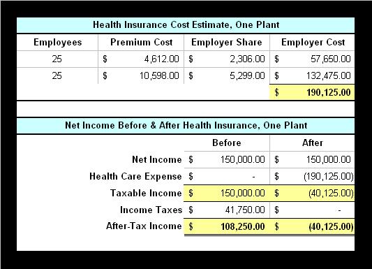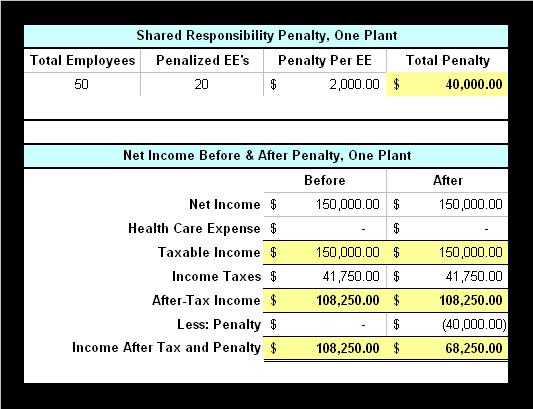 Prior to Obamacare, with its one existing plant, TEA, Inc. would have net income of $150,000, would pay federal income taxes of $41,750, and would be left with after-tax income of $108,250 (see table below). Assuming all things are equal, by 2014 when TEA, Inc. is mandated to provide health insurance at its existing plant, its health care expense will be $190,125 leaving it with a $(40,125) net operating loss, and no federal income tax liability. Since this is out of the question TEA, Inc. will be forced to either reduce its number of full-time employees to below 50, or pay a shared responsibility penalty (i.e. Health Care Tax).